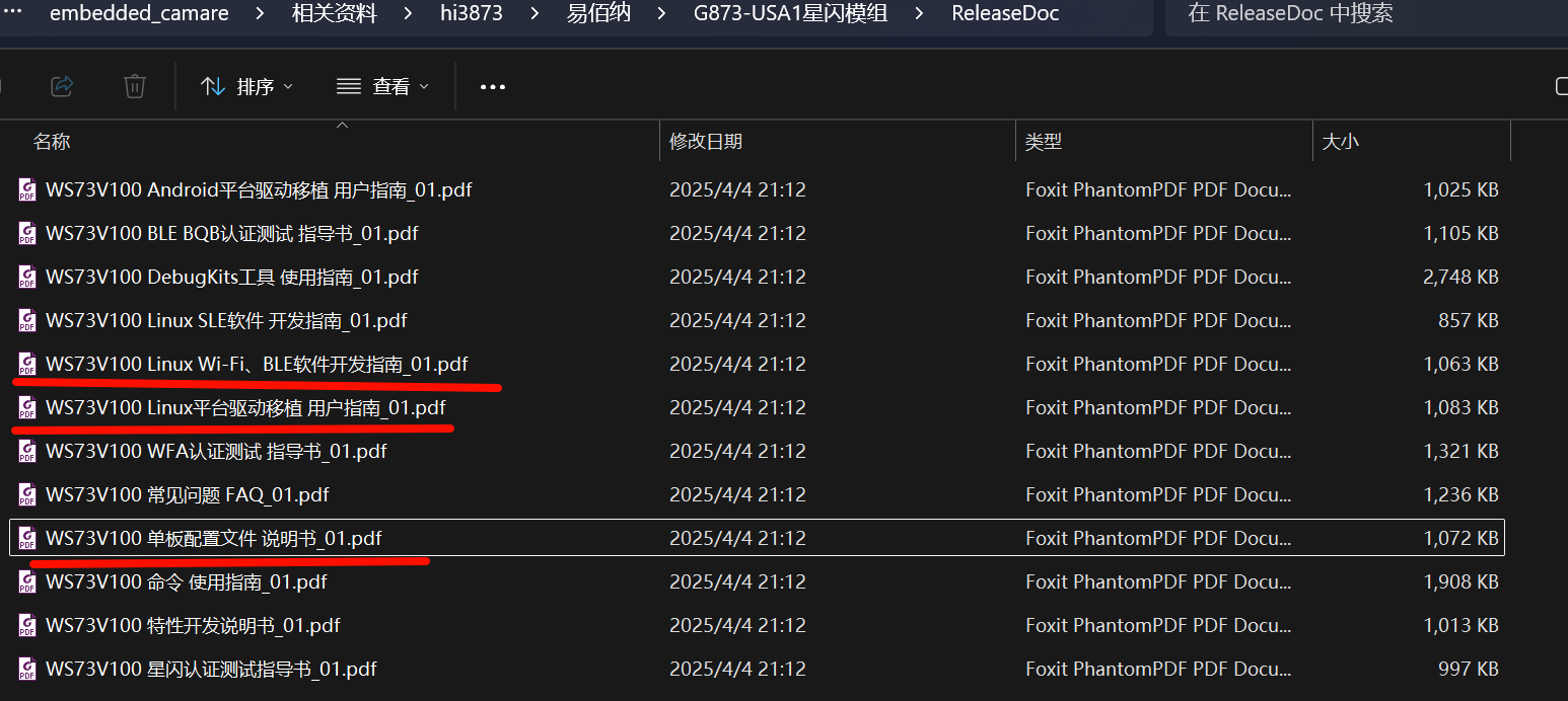 其中的关键文档是《WS73V100 Linux平台驱动移植 用户指南_01》《WS73V100 单板配置文件 说明书_01》《WS73V100 Linux Wi-Fi、BLE软件开发指南_01》,它们非常重要!!!