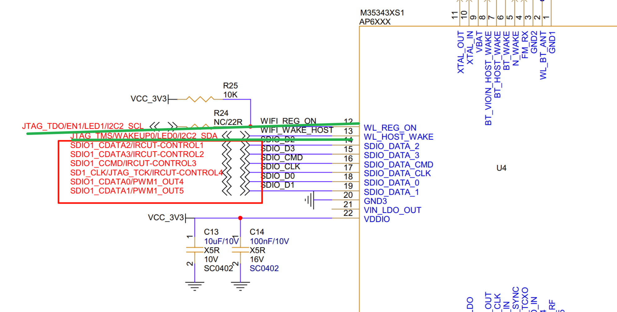 另外还有一个唤醒引脚WL_HOST_WAKE与一个电源引脚WL_REG_ON。在另一张原理图可以知道这两引脚分别连接到Linux板子的GPIO7_5,GPIO7_4。这两都是普通GPIO口。