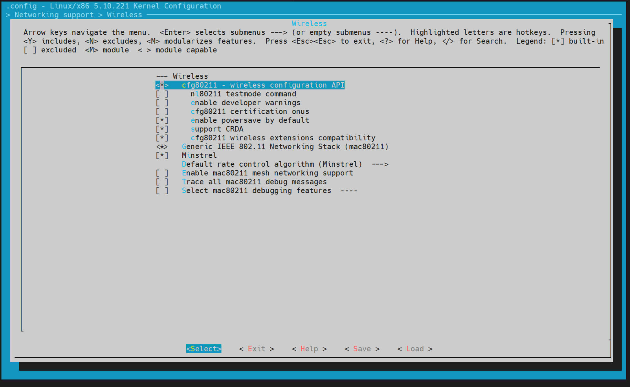 a.进入 Networking support → Wireless,设置 cfg80211 和 mac80211。