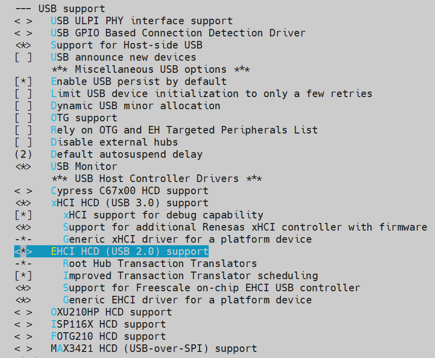 c.进入Device Drivers→USBsupport,设置“xHCI HCD (USB 2.0) support”为*,配置USB
