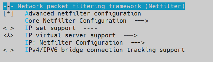 进入Network packet filtering framework (Netfilter),设置“Advancednetfilter